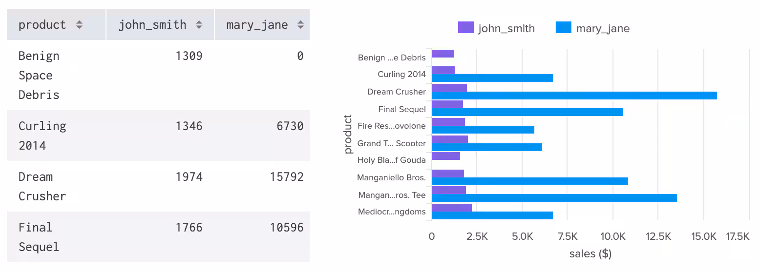 If you’d like to add a second dimension the `chart` command is useful here. For example, comparing sales across products, with an additional breakdown by person: