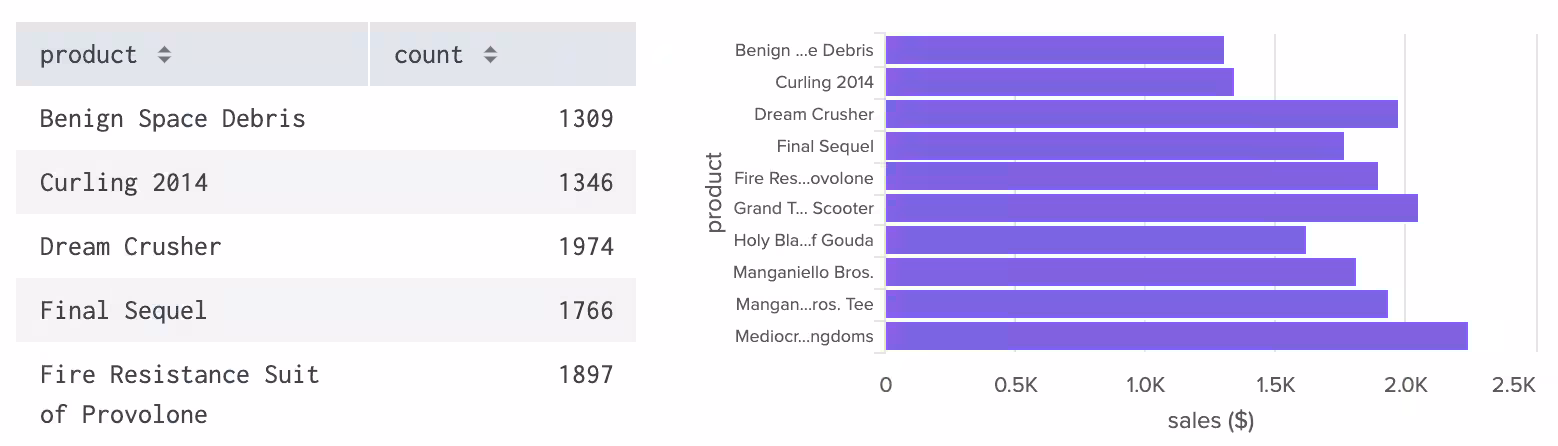 A basic categorical chart can be displayed using the `stats` command. For example, if you’d like determine which product had the most sales last year: