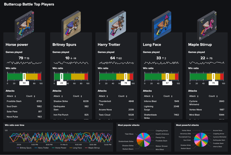 This next dashboard was inspired by our Dashboard Studio based Buttercup Battle game we showcased at .conf23. This example shows one way you can compare multiple entities to one another.