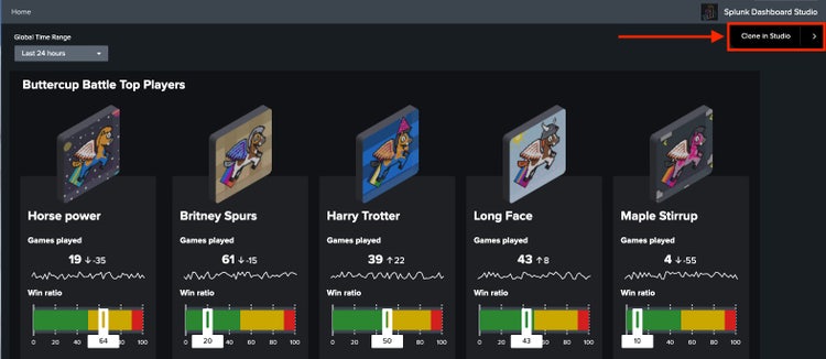 Now, you can use our handy new "Clone in Dashboard Studio" action. In the top right corner of a complete dashboard example, you will see a new button that will allow you to create a dashboard from the example.