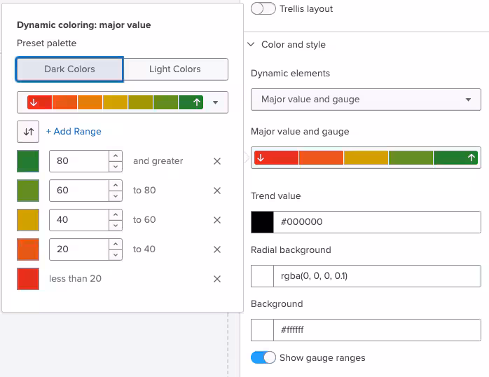 Add a Single Value Radial to your dashboard, then select a Dynamic elements option under Color and style. You'll notice the dynamic coloring options now include gauges.