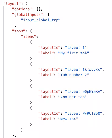 In order to accommodate tabs, we've made a few changes to the source code. Any pre-existing dashboards will be automatically migrated to the new tab-based dashboard definition. Under the layout stanza, you'll see a new section called tabs where you will see the unique IDs and tab names you've specified. They appear in the same order as they are displayed on the canvas.