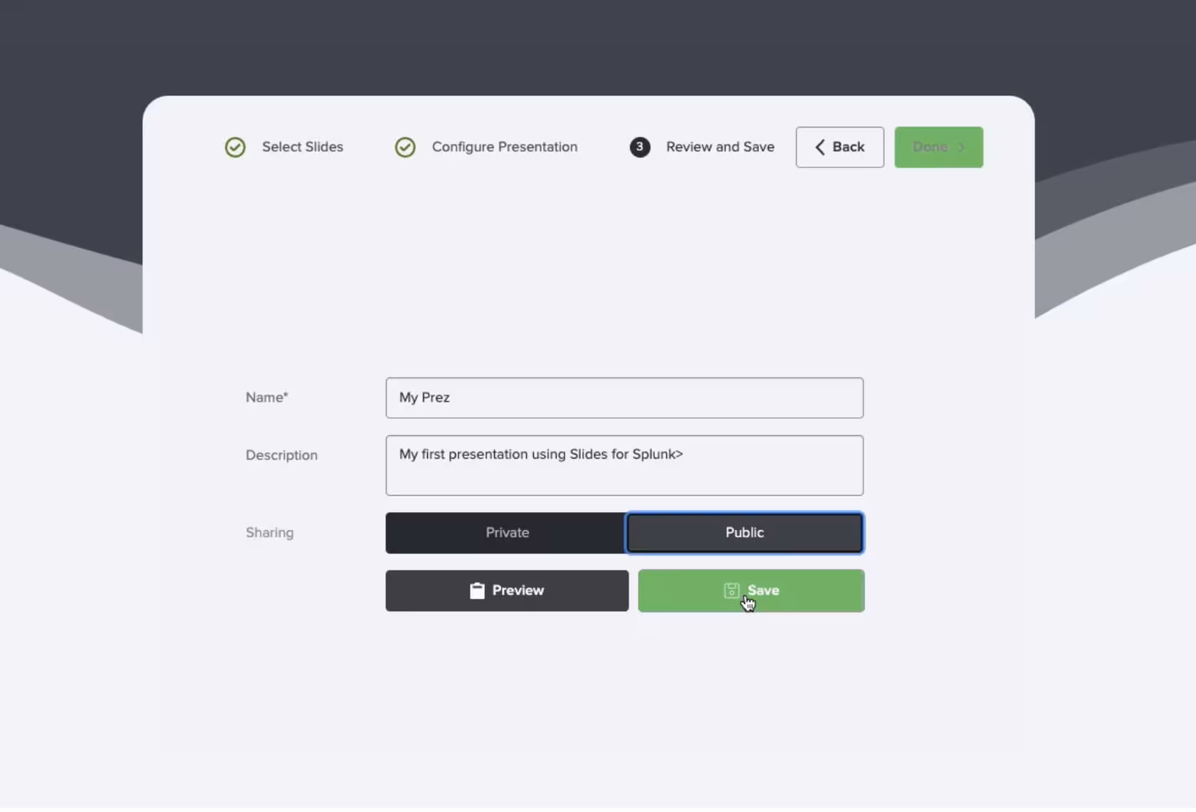 You can either set a name, description, and a sharing level for your presentation or simply preview the presentation to test it.