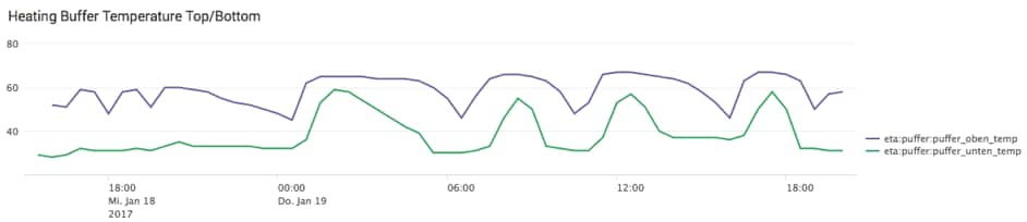 As you can see – until 20:00 the misconfiguration with constant heating start/stop was occurring with the system heating up just a little every time. At about 20:30 I made the configuration changes and in the next day you can see the heating storage can be utilised for far longer with fewer but more intensive heating cycles.