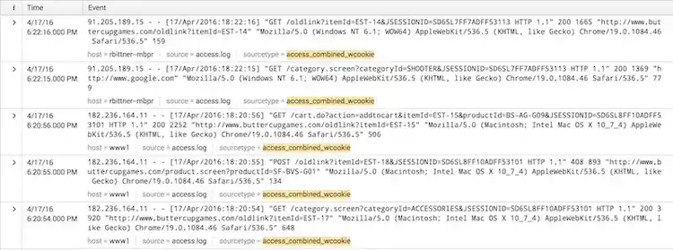 To demonstrate I will use data from our Buttercup games demo data and in particular the Access Combined web log data. Each event has an IP address, the product category as well as much more data. The data looks like this: