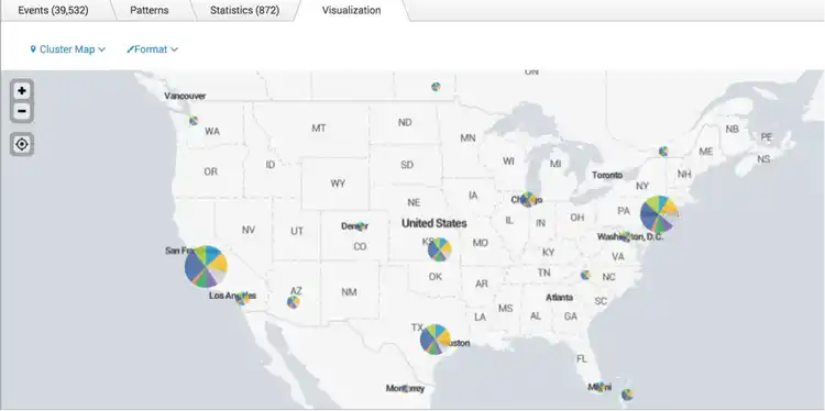 Splunk does that in a pretty smart way. It takes the thousands of individual locations and clusters them in smart positioned locations for better analysis. The size of the dot represents the count of downloads. As you zoom in, these clusters will break up and reveal smaller more local clusters. Note: remember to make sure you are selecting the correct visualization (Cluster Map) in the Visualization tab otherwise you won’t see the map. Things get a little more interesting when you summarize the data on a particular field (I mean the blue dots are nice but don’t tell much of a story).