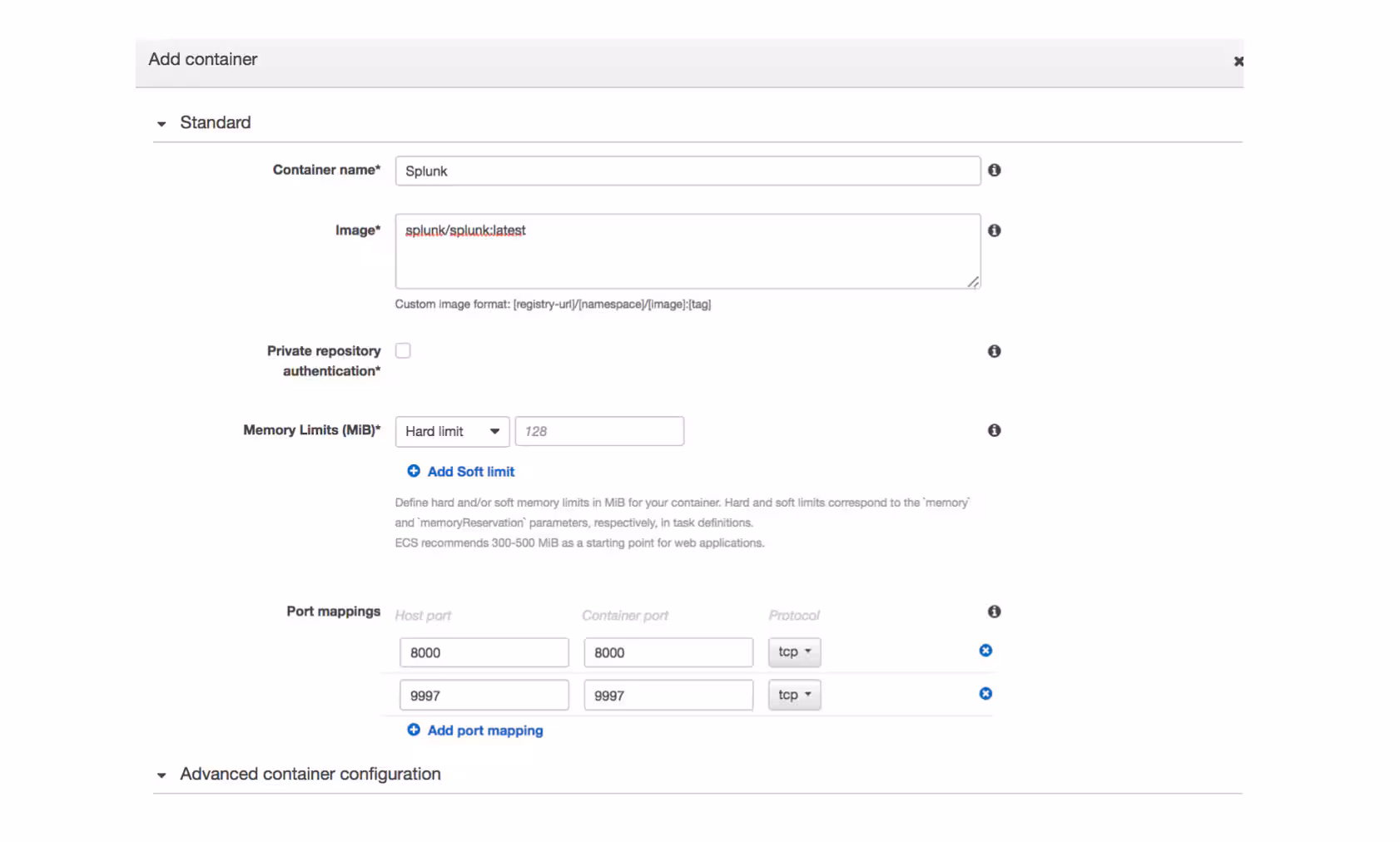 Now click on “Add Container”, and enter a name, and set the image to read from the Splunk image in DockerHub: use splunk/splunk:latest to do this. Note if you wish to use the Marketplace version, you should use the Splunk image here: 217273820646.dkr.ecr.us-east-1.amazonaws.com/00afcccb-7187-4e20-b391-afef9d004be5/cg-3264970572/splunk:7.2.0-latest