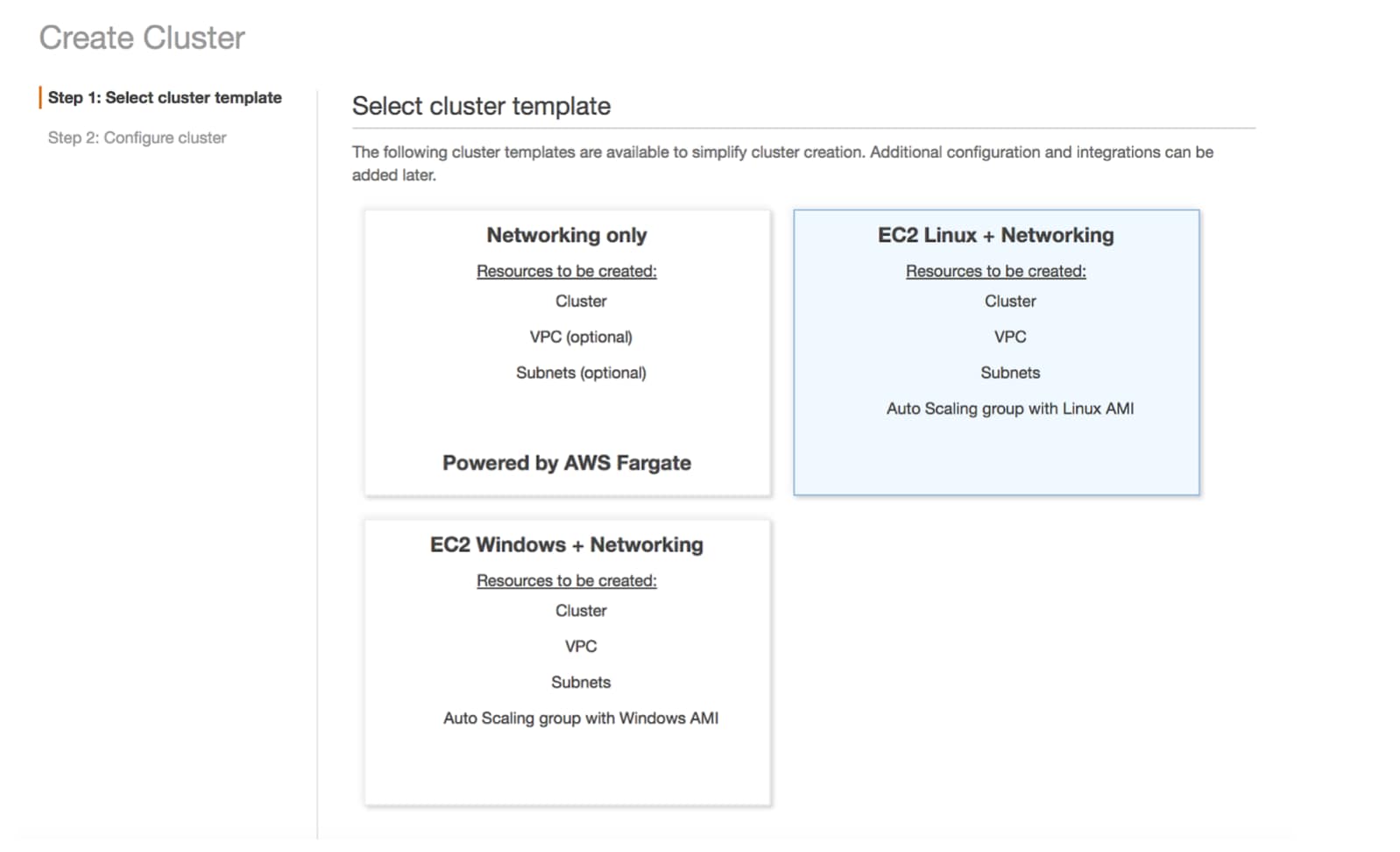 Navigate to ECS in your AWS Console and a Create Cluster – we will use the “EC2 Linux + Networking” option here.