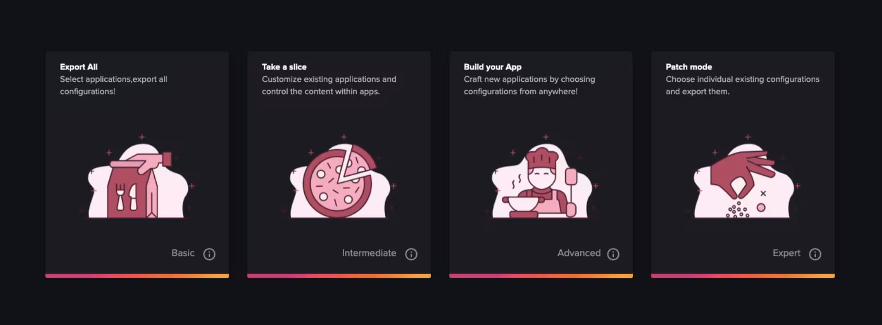 Four possible modes are available:- Export all (Basic): The user can select applications and export/deploy all configurations associated with those applications. This is a simple way to deploy for example many applications to multi Splunk Cloud stacks and hide all the complexity of this process. All the required steps to inspect applications using AppInspect and then to use ACS endpoints will be automated and managed by ACM (App Content Manager).