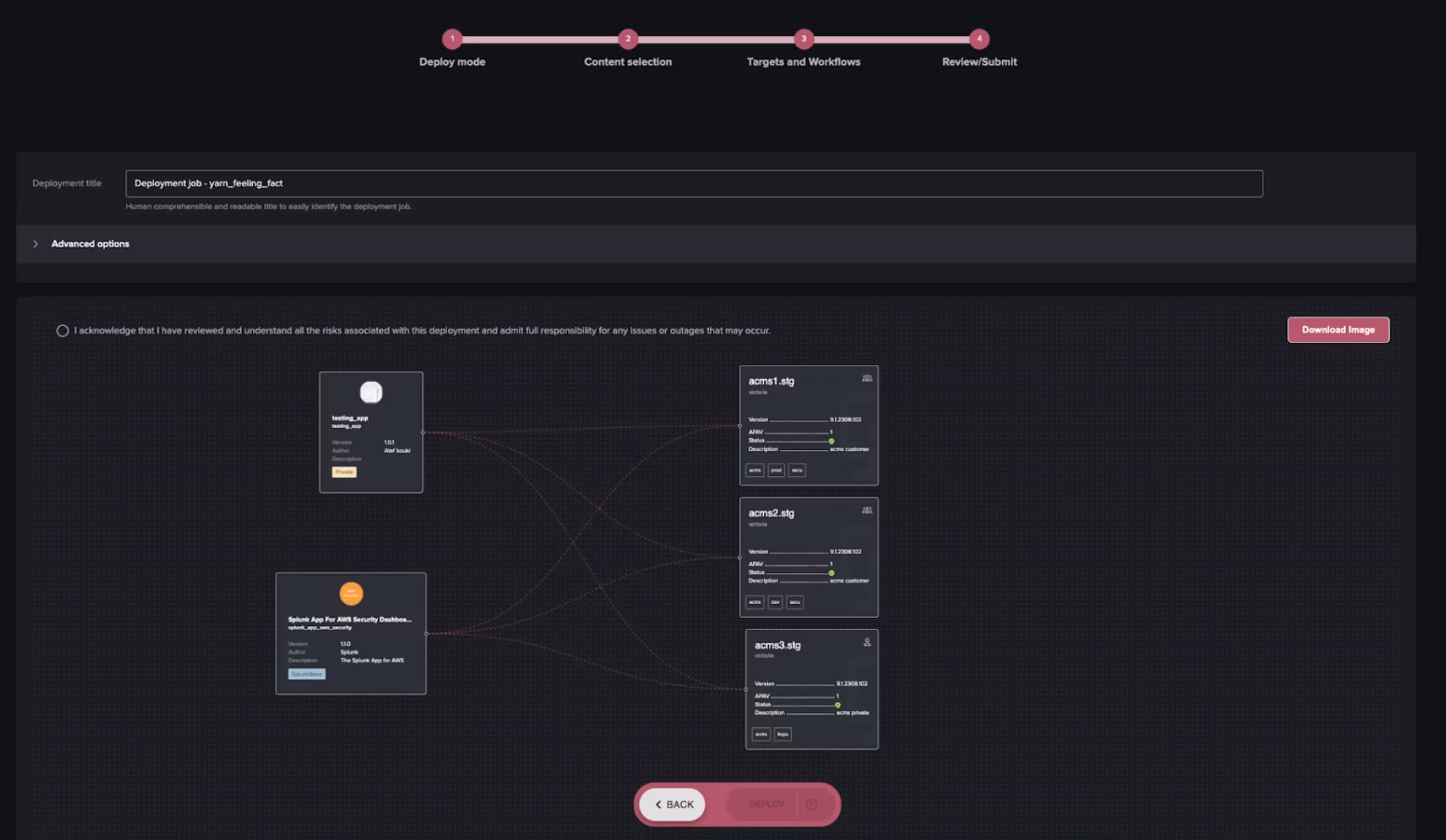 App Content Manager for Splunk empowers administrators as the chefs, granting them the ability to choose the content (whether entire applications or individual configurations), decide on the deployment method (instant or scheduled), and specify the deployment destination (single or multiple stacks), and they even have the capability to establish workflows for executing a sequence of actions or seamlessly integrate with CI/CD pipelines in GitHub.