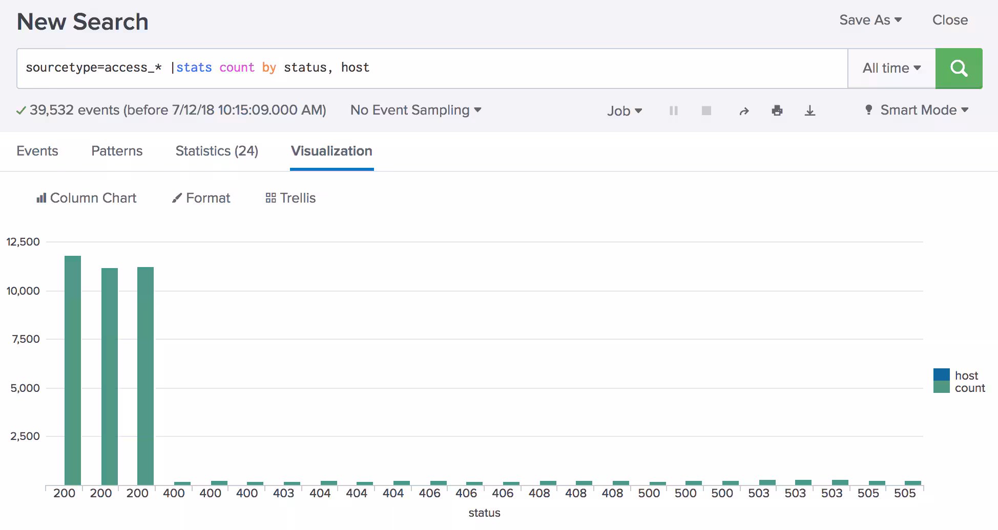 The status field forms the X-axis, and the host and count fields form the data series. The range of count values form the Y-axis.