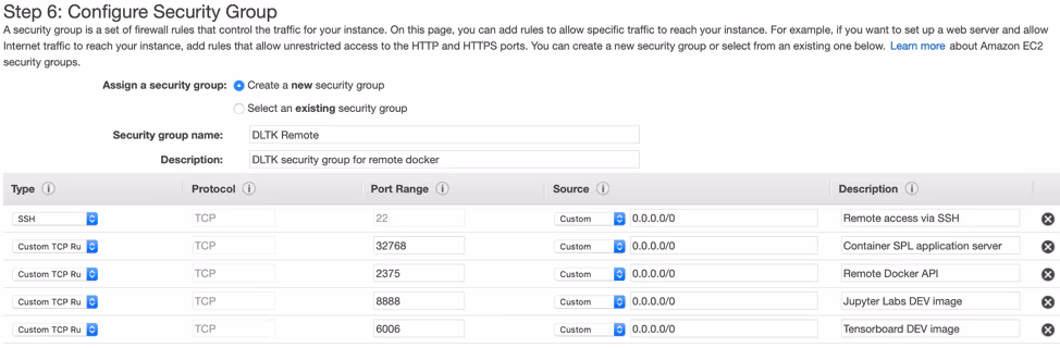 In our setup because it's only for testing we will allow any IP source to connect. It's best to restrict the AWS security group rules to your DLTK/ML search head IP and your IP only. If you want to restrict to specific IP you will need to add your public IP for port 22, 8888 and 6006. For the rest you need to allow only the IP of the Splunk search head which DLTK is installed on.