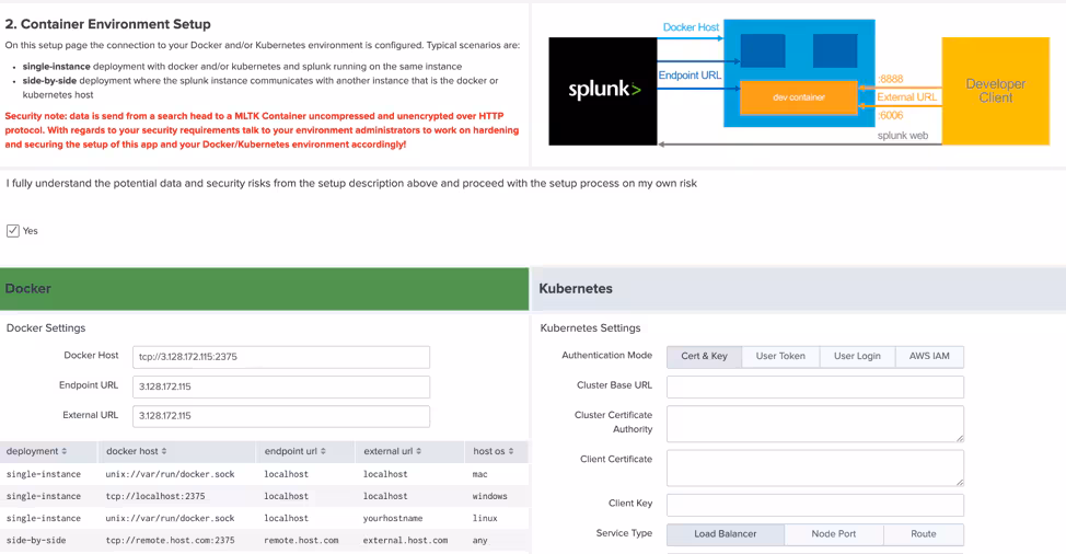 All we have to do now is tell DLTK where the remote docker API and you are all set ! The setup is fast and easy and will allow you plenty of time to focus on developing your models for your own data. From there on DLTK can send commands to docker for creating, starting, stopping containers and getting status information. All this information is then presented to the DLTK UI and sometimes written in relevant Splunk configuration files.