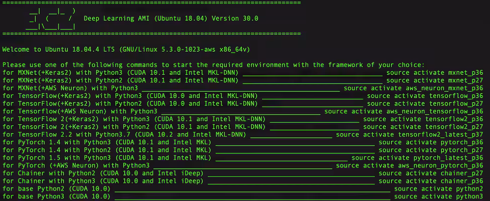 First you need to spin up the required AWS instance. Once you select Launch new instance from your AWS management console , you are taken to the available AMI templates wizard. There you need to search for Deep Learning AMI (Ubuntu 18.04) and select the Ubuntu based AMI — Deep Learning AMI (Ubuntu 18.04) Version 30.x. This image comes preinstalled with the most popular frameworks such as TensorFlow, MXNet, PyTorch, Chainer, and Keras and the latest version of NVIDIA Driver 440.33.01.