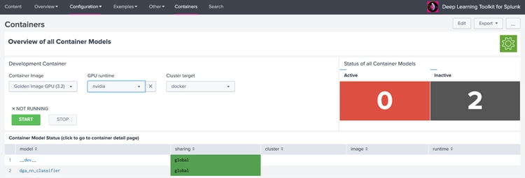 Once you have successfully connected Splunk to the remote docker instance go to Configuration -> Containers and start the golden image with the GPU runtime option set to nvidia (if you haven't done so already).
