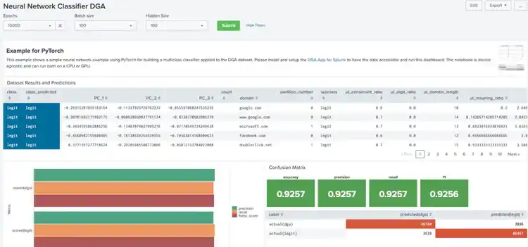 By running our dataset via the “fit MLTKContainer” command we produce a model called pytorch_nn_dga_nn_classifier.pt based on the pytorch_nn.ipynb Jupyter notebook. We can also pass parameters to the model (key/value pairs) such as the epochs, hidden layers etc.