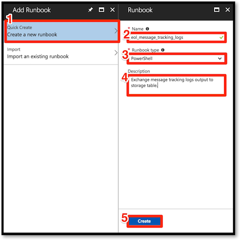 7) Select Create a new runbook. Enter Name, select PowerShell as the Runbook type, enter a Description and select Create.