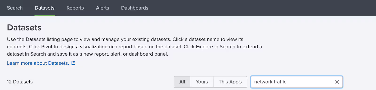 3) Now let’s review how the CIM can map NetFlow traffic fields contained at netflow_index to CIM: For that click on Datasets and filter by Network traffic: click on Network traffic > All Traffic: