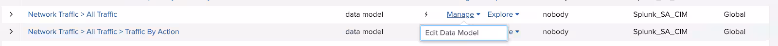 9) Now let’s finally set up data model acceleration. For that click on Datasets, filter by Network traffic and choose Network Traffic > All Traffic click on Manage and select Edit Data Model.