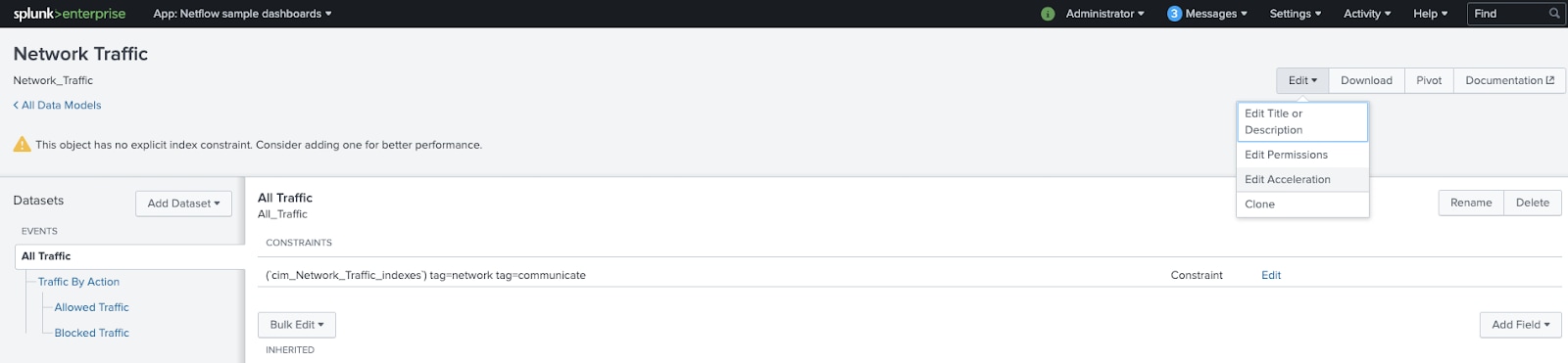 2) Before configuring the acceleration of the data model you will need to add an index constraint to the data model. That is not necessary for a demo/dev environment but in a production environment, you should set an index constraint to optimize the performance of the data model acceleration. Default the constraint will be: (`cim_Network_Traffic_indexes`) tag=network tag=communicate . Click on Edit at the left of the constraint definition and set the constraint to index=netflow_index (`cim_Network_Traffic_indexes`) tag=network tag=communicate so that the acceleration will only be made on the netflow_index. Then click on the green Save button.