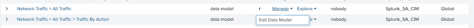 9) Now let’s finally set up data model acceleration. For that click on Datasets, filter by Network traffic and choose Network Traffic > All Traffic click on Manage and select Edit Data Model.