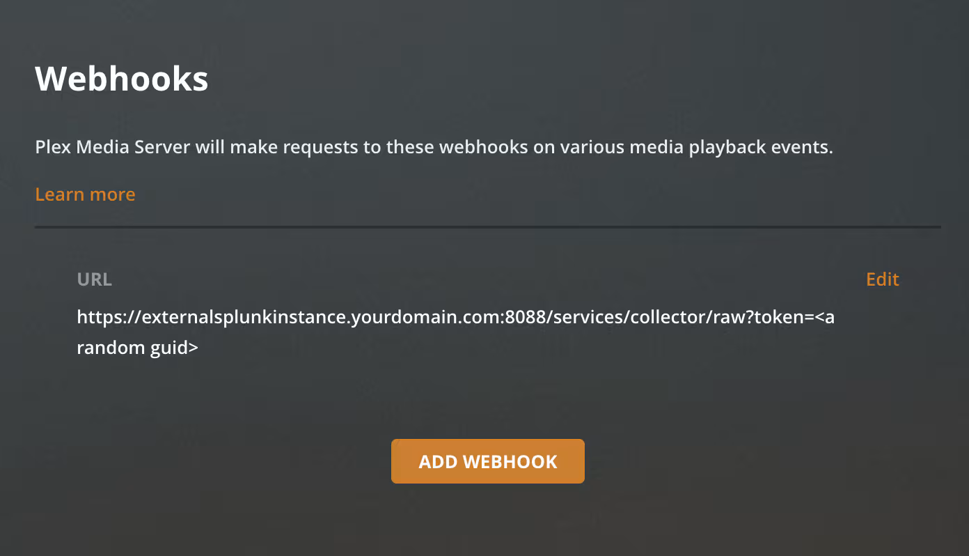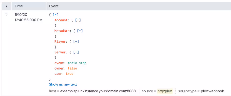 It isn’t just Zoom that allows us to take advantage of this capability to receive webhook posts using HEC. Taking this discovery one-step further, I was setting up Plex at my home and noticed an area to configure webhooks. I used the same method as above and configured Plex to send webhooks to my Splunk setup. I picked a random movie, pushed play, and noticed that the data looked a little different as Plex sends a JSON payload with a form-data Content-Type.