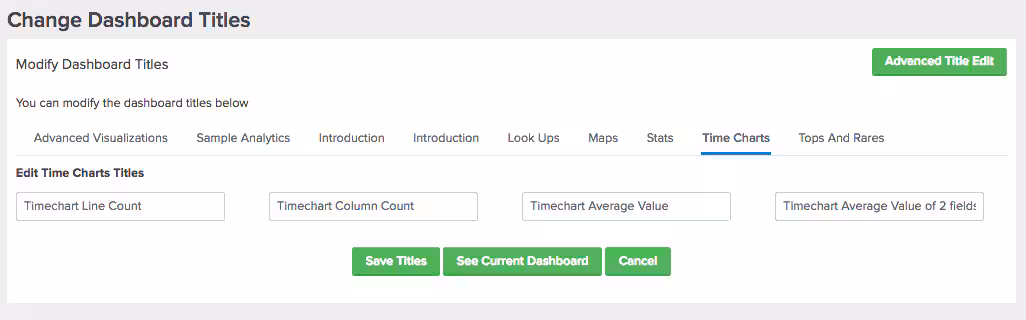 After changing the dashboard macros, you may want to now change the titles of each panel on each dashboard. Under Configure Splunk Start App, click on Change Dashboard Titles.