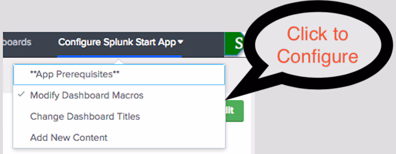 As alluded to above, the app is also for advanced users who already know how to write Splunk searches and create dashboards. Suppose you wanted to create a template-based dashboard to add to the ones that already came with SplunkStart. From the Configure Splunk Start Menu button, click on Add New Content.