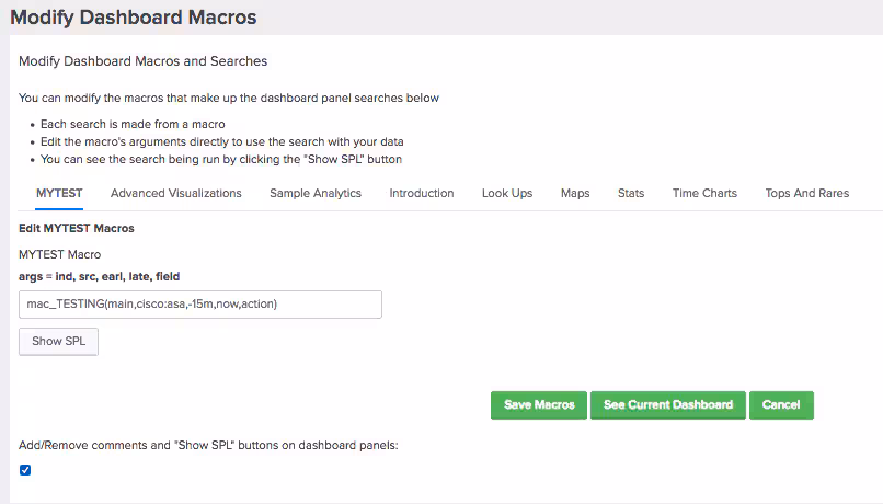Each panel will have comments in blue and a Show SPL button to see how the underlying search and corresponding macro works. For instance:
