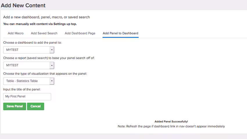 You can now click on Add Panel to Dashboard to use your saved search for inside your dashboard as a panel. I have filled in our sample panel below.