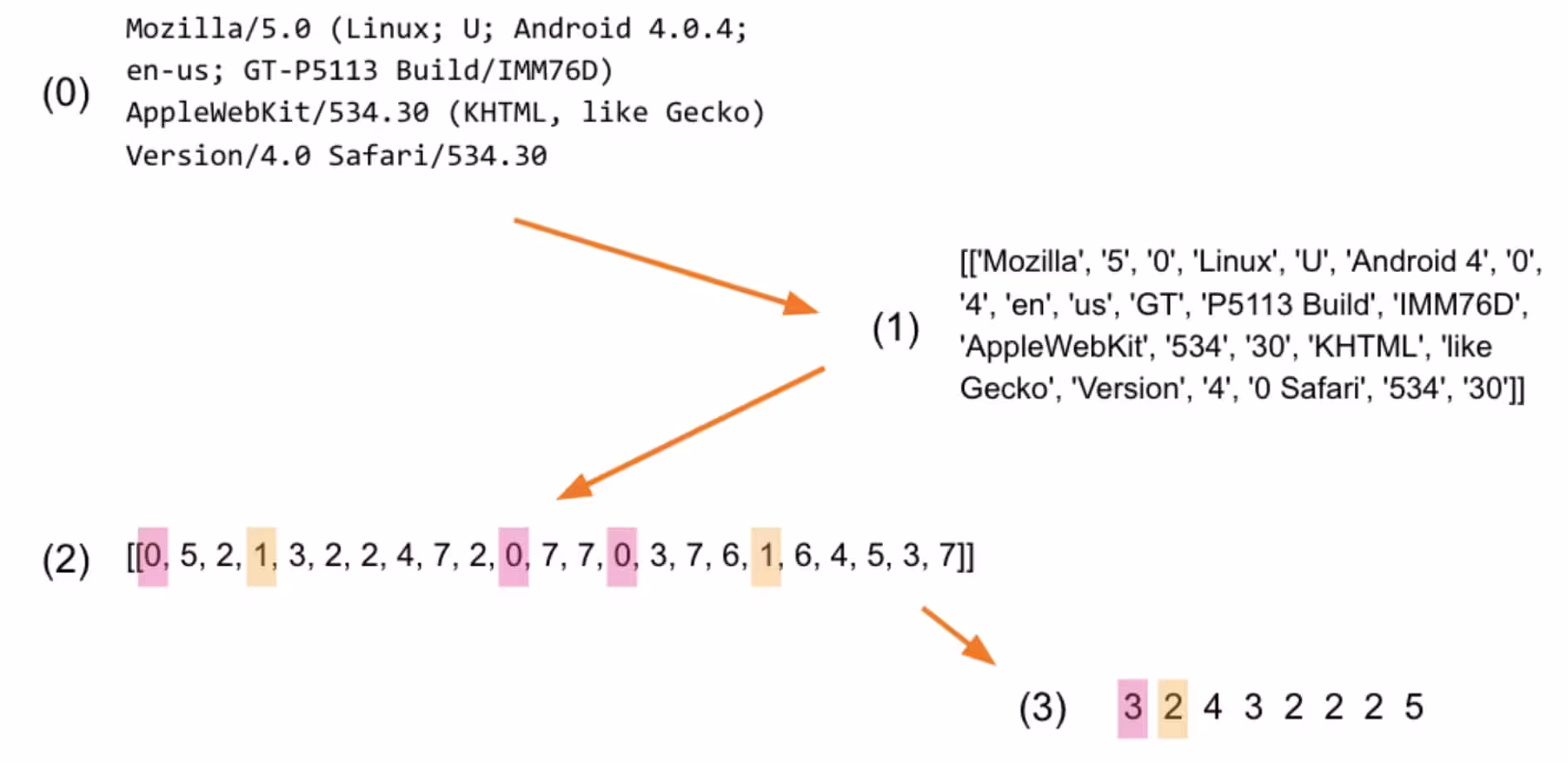This methodology allows us to parse the user agent string (0) into a set of tokens or string elements (1). Each token is then hashed and converted to a number (2), producing a pseudo-random number specific to this particular token. Lastly, a numerical signature (3) is created using this list of numbers, a signature that can then be used to compare user agents.