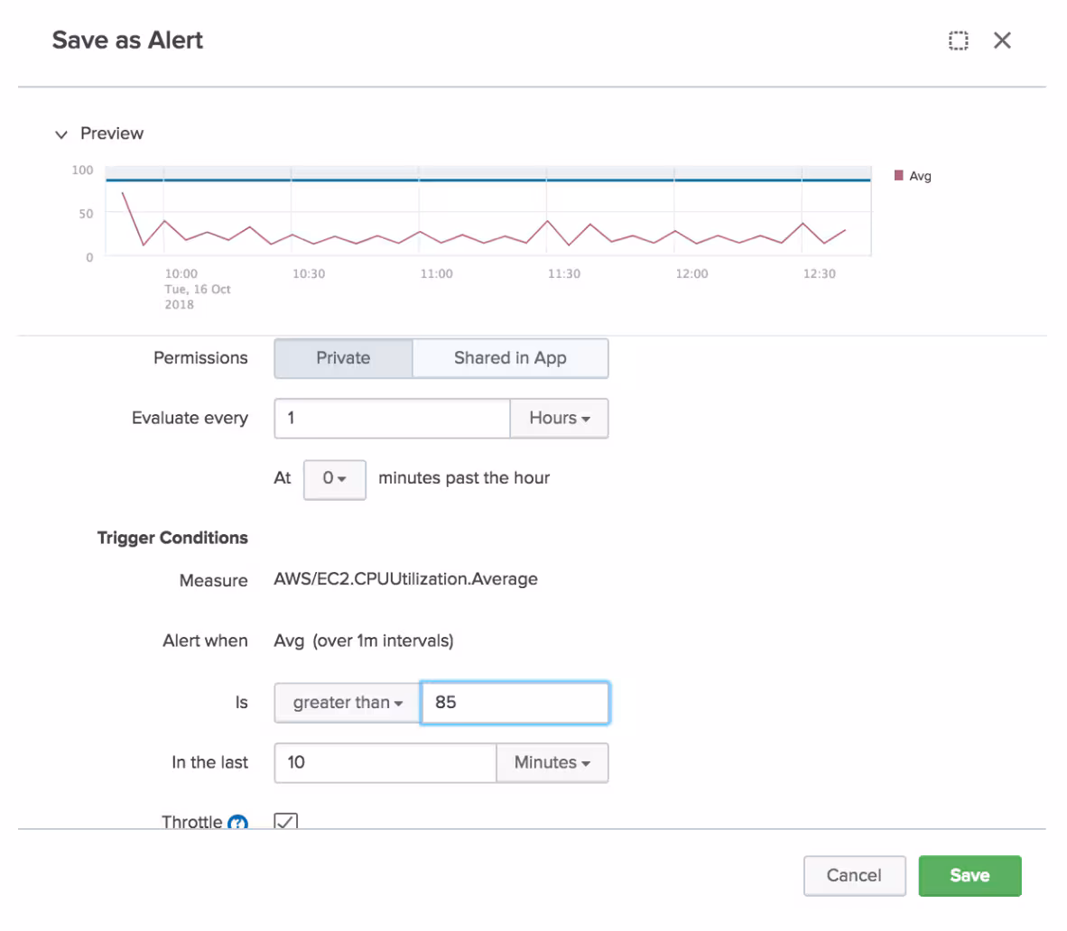 You can now save all these panels individually, or as a collection onto a single dashboard. Behind each panel is still an SPL search (you can open up as a search to view the SPL). You can also set up alerts, such as the one I’ve set below to trigger if the CPU average is >85%:
