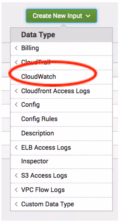 Step 3: Navigate to the AWS TA in Splunk, and open the Inputs tab. You will need to add a new input – click on “Create New Input” and select the “Cloudwatch” input: