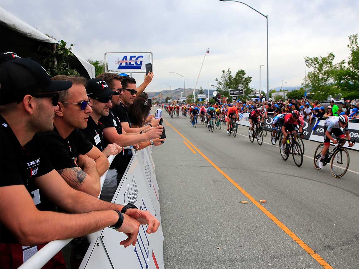 Trek-Segafredo staffers watch the race pass a hospital tent on the 2019 Tour of California.