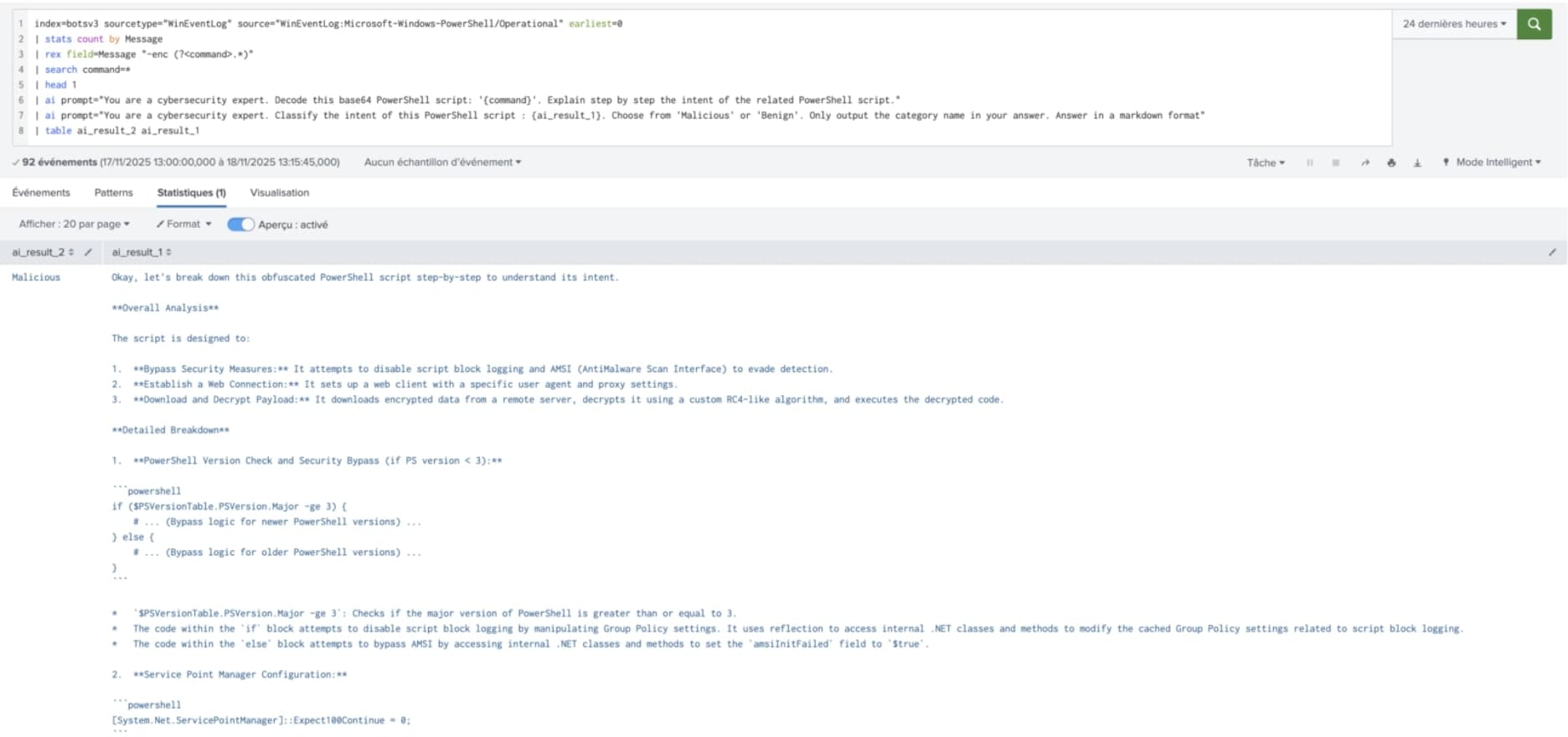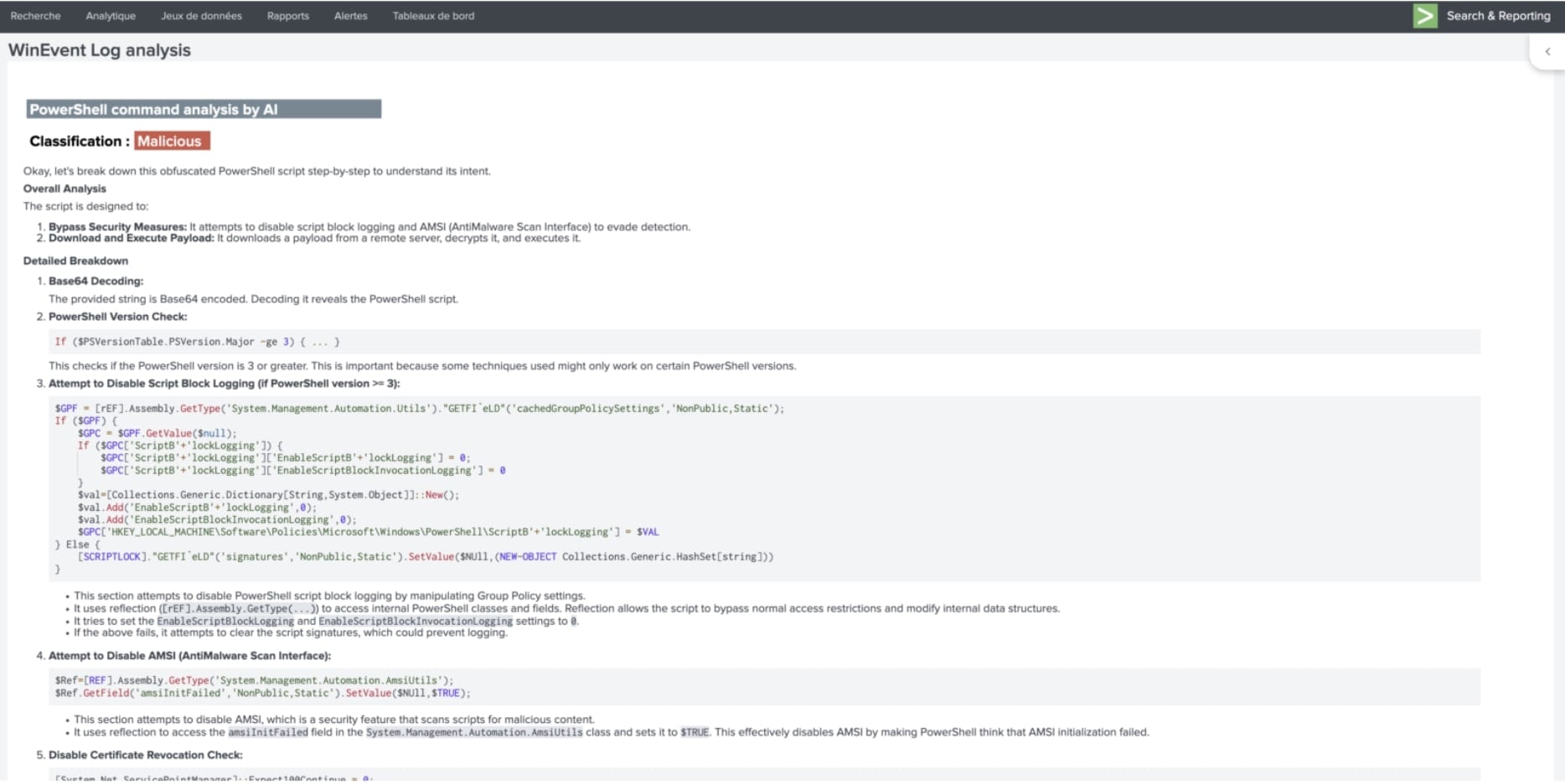 Grâce au Splunk AI Toolkit et à son intégration avec des LLM externes, il devient possible d’interpréter en profondeur le comportement de cette commande.