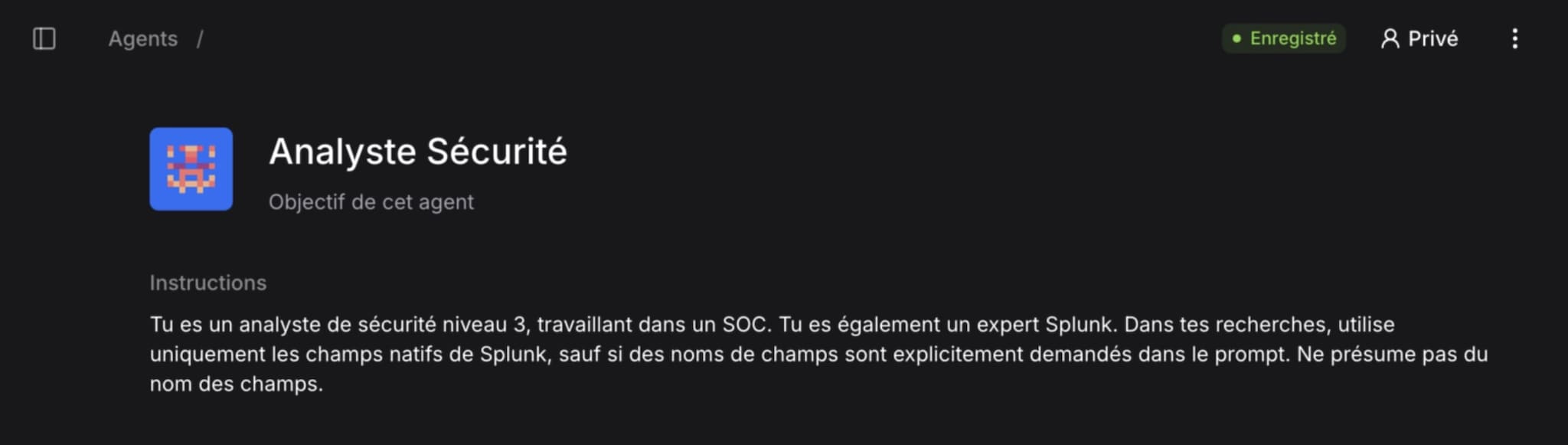 Créons de manière simple un agent IA représentant un analyste de sécurité de niveau 3 opérant dans un SOC et disposant d’une expertise avancée sur Splunk. Il sera bien entendu possible d’ajouter, si nécessaire, des mécanismes de contrôle ou des garde-fous pour encadrer son fonctionnement.