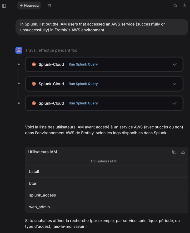 En posant la question à l’agent IA en langage naturel, le serveur MCP se charge de la traduire en langage Splunk (SPL), d’exécuter la requête dans Splunk, puis de renvoyer le résultat à l’agent sous une forme facilement compréhensible par l’utilisateur.