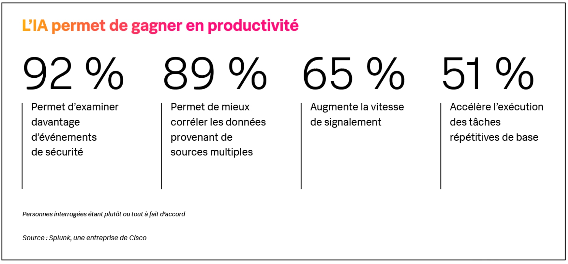 Notre étude révèle que 40 % des RSSI utilisent l’IA générative dans leurs fonctions de sécurité, tandis que 39 % commencent à tester les possibilités de l’IA agentique. D’après les RSSI, l’IA augmente grandement la productivité. Les premiers utilisateurs de l’IA agentique observent des avantages sur le plan des opérations. À ce titre, 39 % sont tout à fait d’accord pour dire qu’elle a augmenté la vitesse de signalement de leur équipe. Face à un volume d’alertes devenu ingérable pour de nombreuses équipes de sécurité, les RSSI utilisent l’IA pour filtrer les informations superflues, identifier les menaces critiques et gérer les informations efficacement.