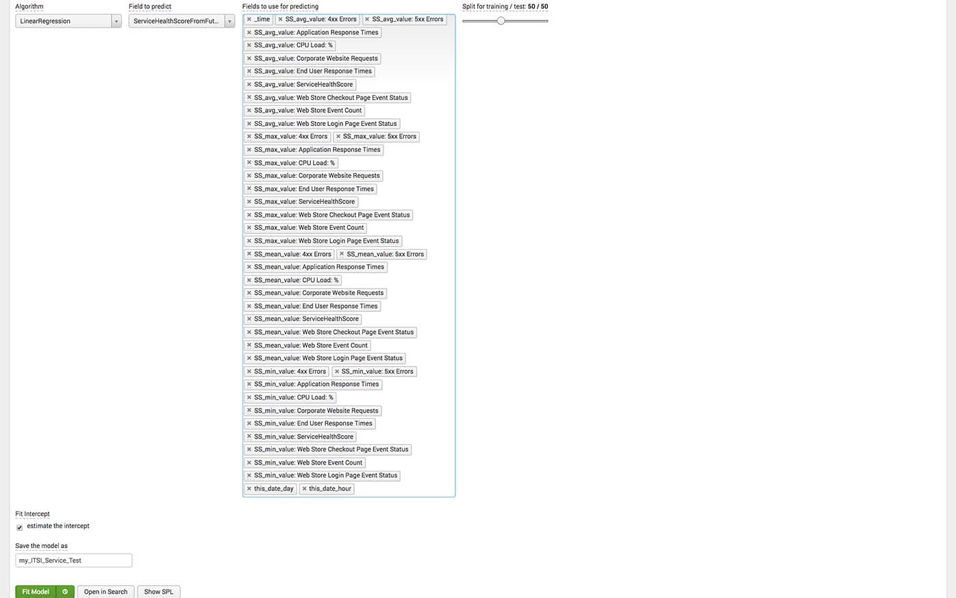 予測したいフィールド(ServiceHealthScoreFromFuture: 30分後のサービス健全性スコア)を選択し、正規化されたフィールド(SS_で始まるフィールド、_time、this_date_day、this_date_hour)を使用して、標準偏差アルゴリズムによってモデルを作成し、my_ITSI_WebService_Test.eと名付けました。